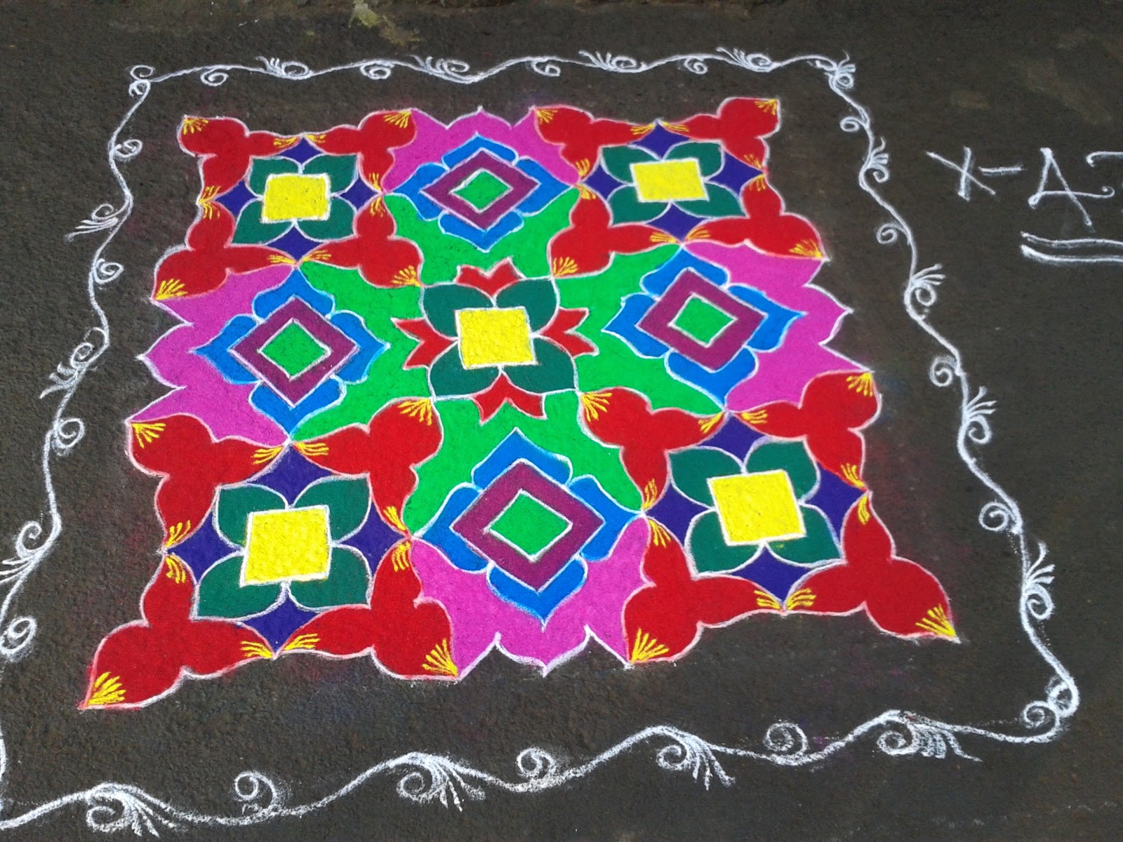 Rangoli, also known as Kolam, is a folk art from India. Rangoli are decorative designs made on the floors of living rooms and courtyards during mainly Hindu festivals and also in events like competations.